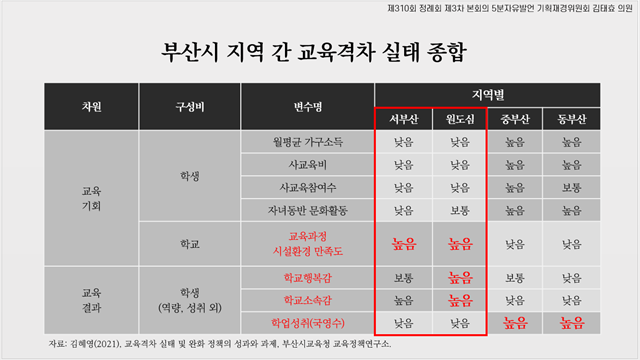 부산시교육청 교육정책연구소의 「교육격차 실태 및 완화 정책의 성과와 과제(2021)」에 따르면 서부산과 원도심 지역의 학생들이 학교에 대한 ‘교육시설환경 만족도’가 높고, ‘학교 행복감과 학교 소속감’이 높은 것으로 보고되고 있다. 이는 가정에서의 교육 기회 결핍을 학교 교육활동을 통해 보완하고 있다고 보고 있다.