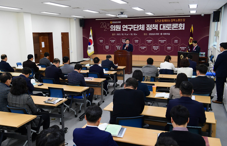 [경남 세계타임즈=최성룡 기자] 경상남도의회(의장 김진부)는 12월 11일 경상남도의회 대회의실에서 「2023 의원 연구단체 정책 대토론회」개회식을 갖고, 올해 의원 연구단체에서 추진한 17개 과제에 대해 양일간 7개의 세션 토론회를 개최한다.