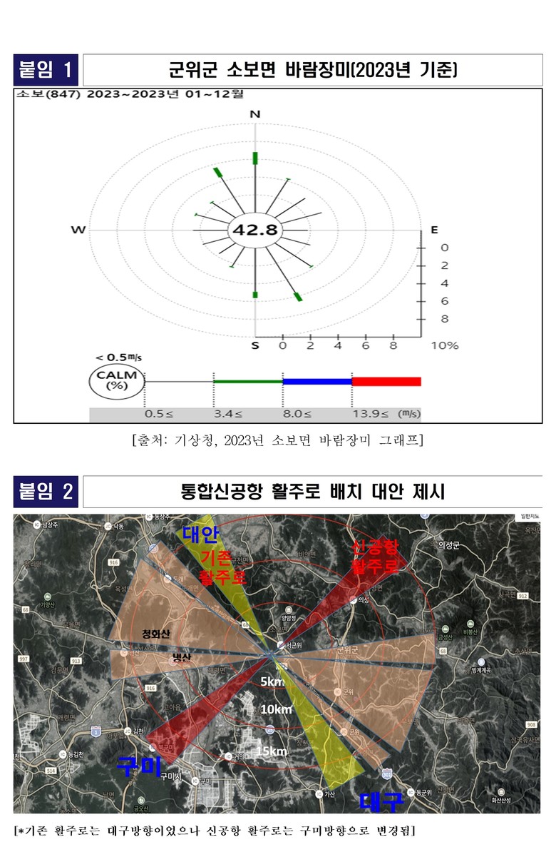윤 의원은 전략환경영향평가 보고서에 의하면 지금의 대구공항 활주로 방향이 신공항으로 이전되면서 완전히 꺾이고 있는데 이에 따라 구미시는 소음의 직ㆍ간접적인 영향을 받게 될 것이라며 활주로 방향에 대한 재검토가 필요함을 지적했다.