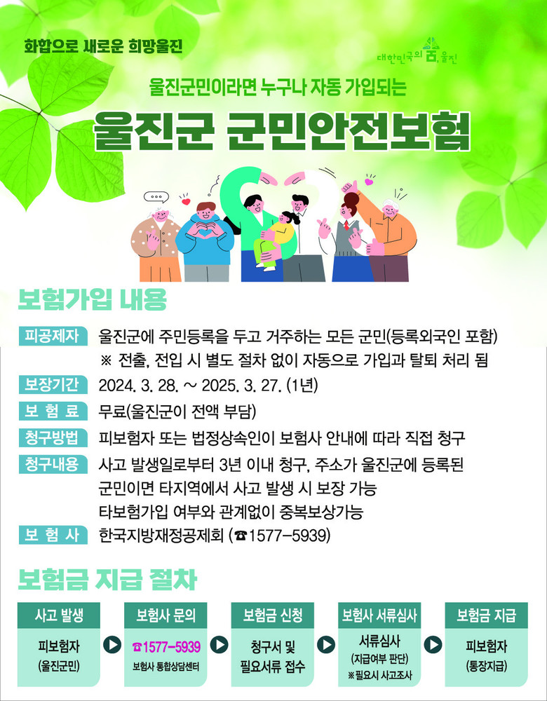 군민안전보험은 2017년부터 9년째 추진하는 사업으로 관내 주민등록을 둔 군민이면 별도의 절차나 조건 없이 자동으로 보험 수익자가 되며 관내 외국인 등록대장에 등록된 울진군 내 외국인도 혜택을 받을 수 있다.