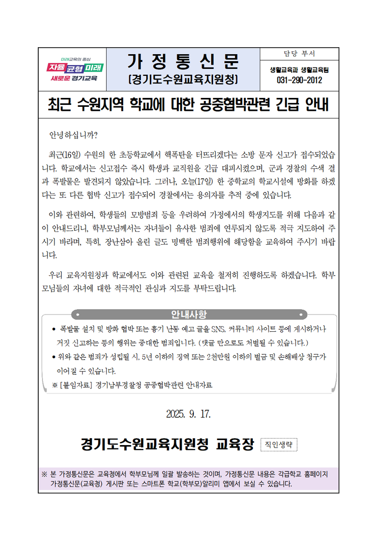 ◦ 모방 범죄에 대한 엄중 경고 및 관련 교육 강화 방침 [경기도 세계타임즈=송민수 기자] 경기도수원교육지원청(교육장 김선경)은 수원 지역 학교를 대상으로 연이어 발생한 학교 폭파 및 방화 협박 예고와 관련, 교육공동체의 불안감 해소 및 안전 확보를 위해 17일, 신속한 대응에 나섰다.