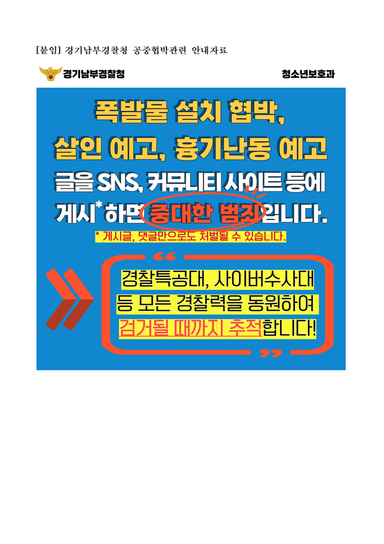 특히 이번과 같은 폭발물 설치, 방화 협박 예고 글을 SNS나 커뮤니티 사이트 등에 게시하거나 거짓 신고하는 행위는 호기심, 장난 등 어떠한 이유를 불문하고 중대한 범죄임을 강조하며, 교육지원청과 각 학교에서도 이와 관련된 교육을 철저히 할 예정임을 안내했다.