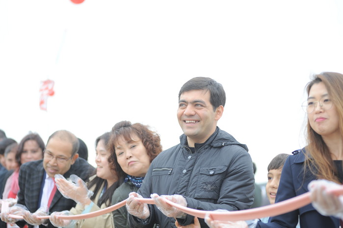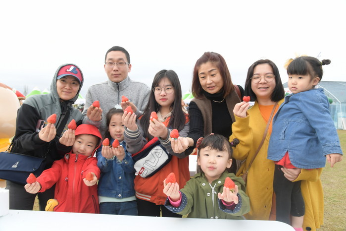 관람객들이 딸기 떡메치기 체험을 하고 있다.