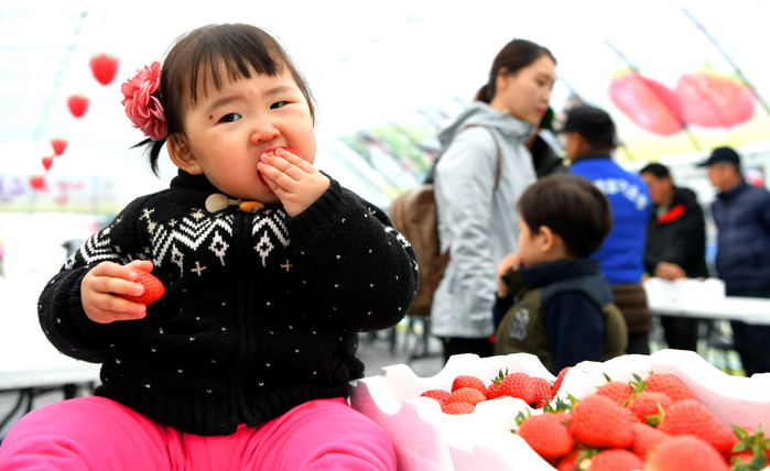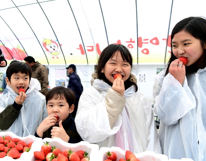 초통령 번개맨이 논산딸기축제장에 떴다! 4일부터 8일까지 5일간의 일정으로 논산천 둔치와 딸기밭 일원에서 열리는 ‘2018 논산딸기축제’가 개막한 가운데, 아이들이 번개맨 공연을 보며 즐거워하고 있다