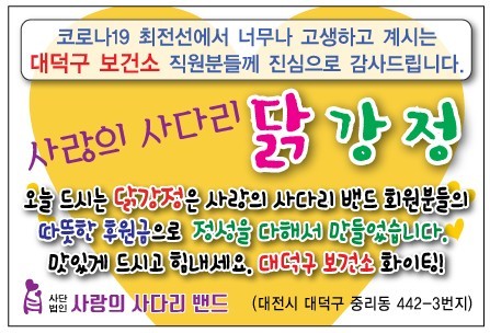 대덕구보건소 라미경 감염병관리팀장은 ”오늘 사랑의 사다리 밴드 봉사단체에서 닭강정을 지원해주어서 큰 힘과 위안이 된다.“면서 ”코로나 19가 하루속히 종식될 수 있도록 대덕구 보건소는 최선의 노력을 다하겠다.“고 말했다.