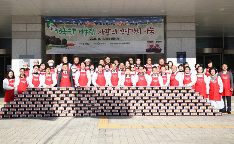 최대호 안양시장 “해남군 사랑의 김장김치와 기부에 깊이 감사” [세계타임즈=안양시 송민수 기자] 안양시는 14일 오전 10시30분 안양시청 앞마당에서 청정지역 전남 해남군과 함께 따뜻한 마음을 나누는 ‘2025년 김장김치 나눔행사’를 개최하고, 상호 우의를 다지는 고향사랑기부금 전달식을 가졌다.
