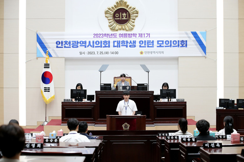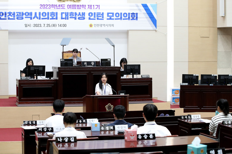 인천시의회(의장 허식)는 25일 시의회 본회의장에서 대학생 인턴 10명이 참여한 가운데 ‘2023학년도 여름방학 제1기 대학생 인턴 모의의회’를 개최했다.