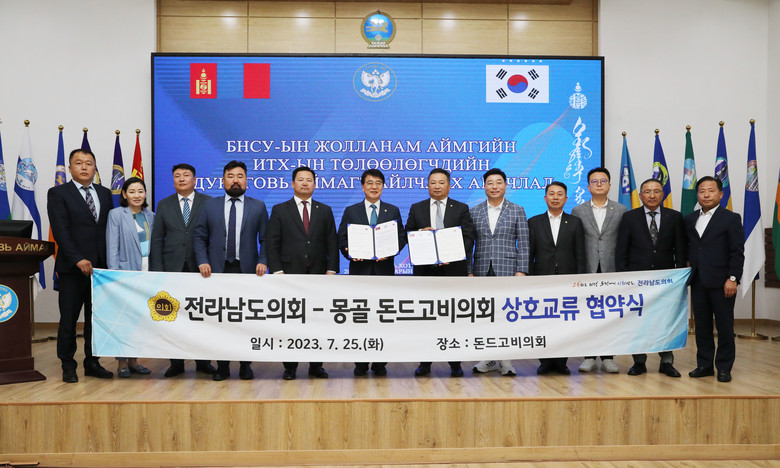 [전남 세계타임즈=우덕현 기자] 전라남도의회(단장 김태균 부의장)는 지난달 25일, 몽골 돈드고비의회를 방문해 양 의회 간 농업 기술 협력과 상호 교류 등을 주된 골자로 하는 우호교류 협약을 체결했다.