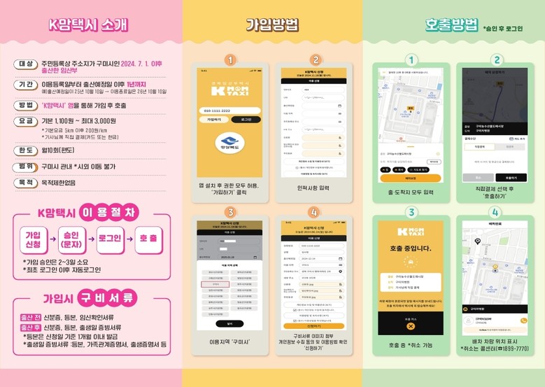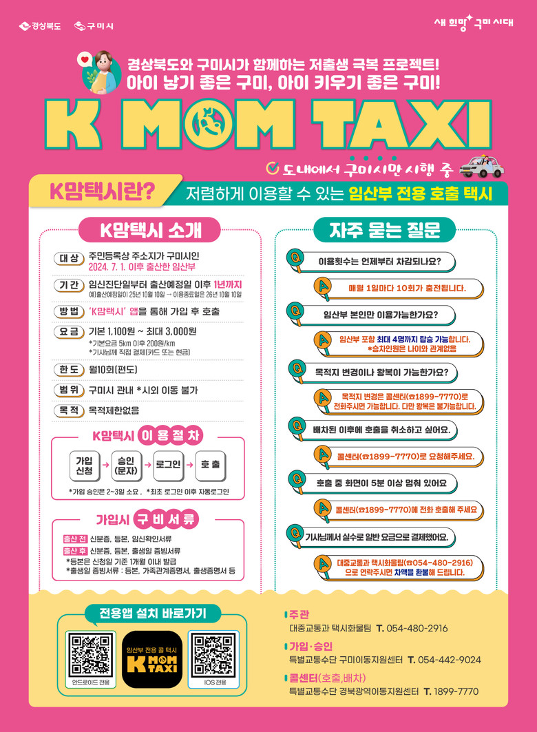 ‘K맘택시’는 경상북도 내에서 구미시가 단독으로 운영 중인 임산부 전용 교통 서비스다. 임산부는 1,100원에서 최대 3,000원만 내면 구미시 전역을 이동할 수 있으며, 월 10회까지 목적에 관계없이 자유롭게 호출 가능하다.