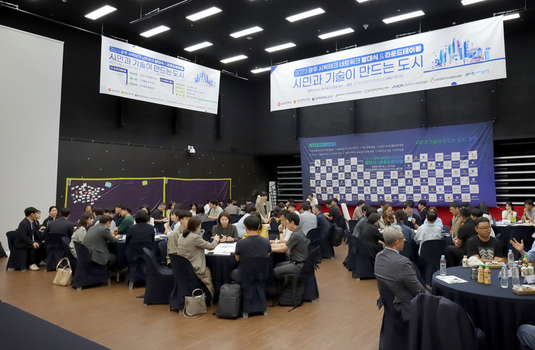 발대식에 앞서 진행된 1부 ‘라운드테이블’에서는 광주 지역이 안고 있는 대표적인 도시문제 10가지를 발굴하고, 시민참여와 기술을 결합한 해결방법을 찾기 위해 지혜를 모았다. 각 분야별로 시민연구원 3명, 기업 관계자 3명, 기관 및 퍼실리테이터로 구성되어 테이블마다 8명씩, 약 100여명이 모여 집단토의 방식으로 진행되었으며, 분야마다 관심을 갖고 있는 광주 지역 5개 자치구 구의원들이 결합하여 직접 참여함으로써 그 의미를 더했다.