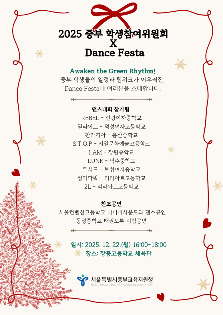 이번 페스타에는 중부 관내 중학교·고등학교 학생 동아리 및 팀들이 참여하여 다양한 장르의 댄스 공연을 선보였으며, 각 팀은 무대 구성과 퍼포먼스에 자신들의 메시지와 이야기를 담아 학생 문화의 다양성과 창의성을 표현하였다.