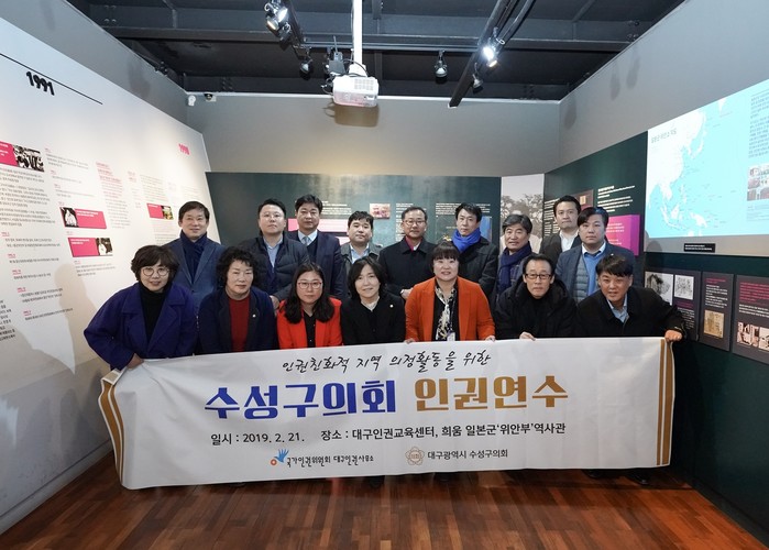 지난 21일 대구인권교육센터에서 개최된 인권교육에 수성구의회 의원 18명이 참석하여 박민경 국가인권위 조사관의 ‘인권의 이해와 국가인권위원회의 역할’, 서준호 대구장애인 인권연대 대표의 ‘장애, 차별과 혐오’, 남은주 대구여성회 대표의 ‘여성, 차별과 성희롱’을 주제로 한 강의를 듣고 질의응답 및 토론을 진행하였으며, 마지막 일정으로 위안부역사관 ‘희움’을 방문하여 3.1절을 앞두고 일본군 ‘위안부’ 문제에 대해 한번 더 고민하는 시간을 가졌다.