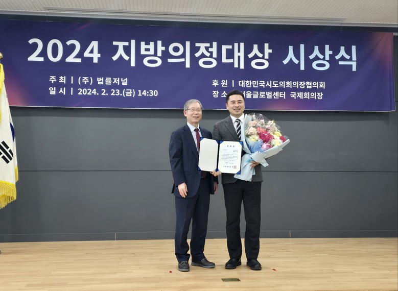 2024 지방의정대상은 대한민국시도의회의장협의회가 후원하고 ㈜법률저널이 주최하는 상으로 상임위원회 활동과 주민과의 소통 노력, 타 지역과 국회에서의 활동내역까지 지방의회 의원들의 의정활동 전반을 심사해 수상자를 선정한다. 이번에는 전국 17개 광역시·도의원 중 총 19명의 의원들이 최종 수상자로 선정됐다.