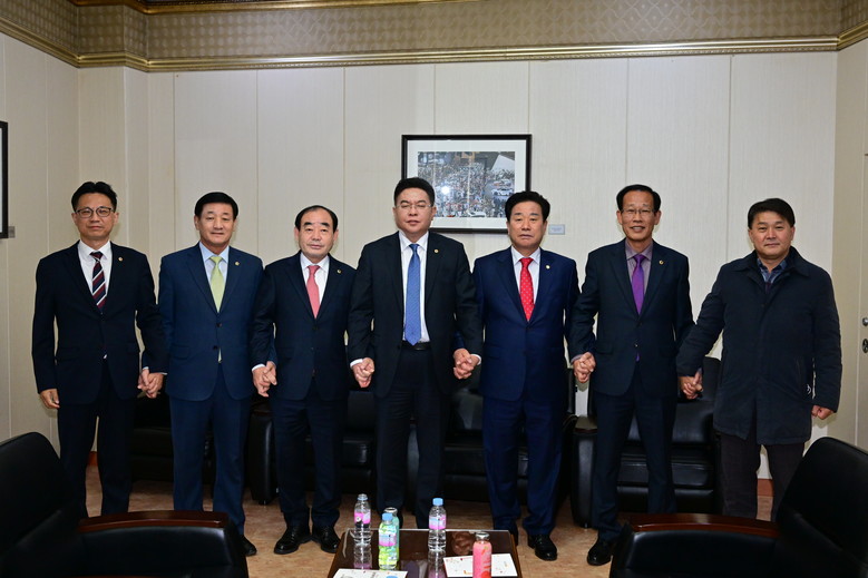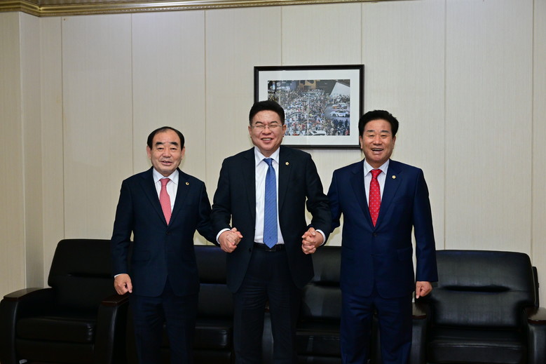 ▲ 울산‧부산‧경남 의장단(왼쪽부터 김기환 울산시의회 의장, 안성민 부산시의회 의장, 김진부 경상남도의회 의장)이 25일 오후 5시 부산 벡스코 제1전시장 3층 회의실에서 개최된 “부.울.경 시.도의회 상생 협력 합동 워크숍”에 앞서 기념촬영을 하고 있다.
