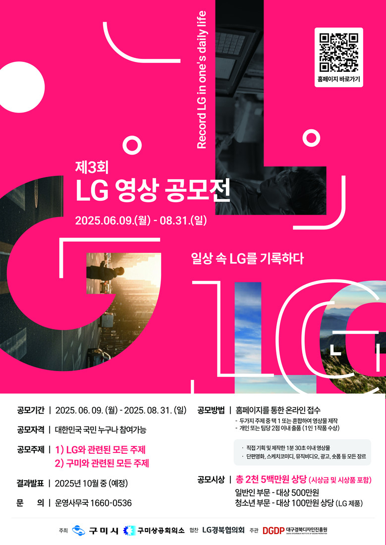 제3회를 맞는 LG 영상공모전은 참가자가 직접 기획하고 제작한 1분 30초 이내의 영상 작품을 대상으로 한다. 개인 또는 팀 단위로 응모할 수 있으며, 주제는 △LG와 관련된 모든 주제 또는 △구미시와 관련된 모든 주제 가운데 자유롭게 선택할 수 있다.
