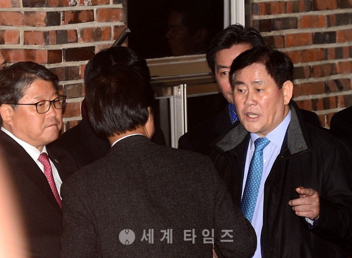 박근혜 전 대통령이 서울 삼성동 사저에 도착한 가운데 12일 오후 서울 삼성동 박 전 대통령 사저 앞에 자유한국당 조원진, 최경환 의원등이 모여 이야기를 나누고 있다. 2017.03.12.