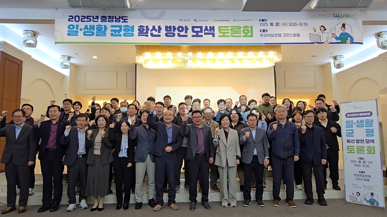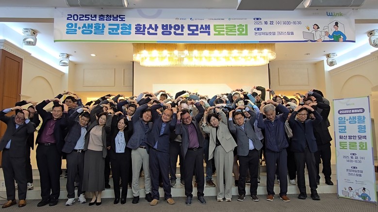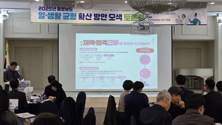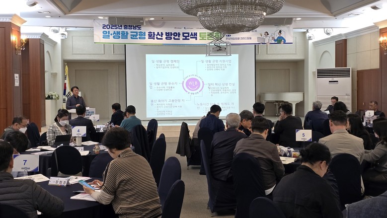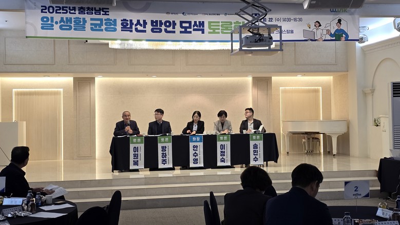 도는 22일 아산 온양제일호텔 크리스탈홀에서 홍봉택 도 노사민정협의회 일생활균형 분과위원장, 이원복 도 노동정책팀장, 안영일 대전지방고용노동청 팀장, 안수영 충남사회서비스원 선임연구원 등 70여 명이 참석한 가운데, ‘2025 충남도 일·생활 균형 확산 방안 모색 토론회’를 개최했다.