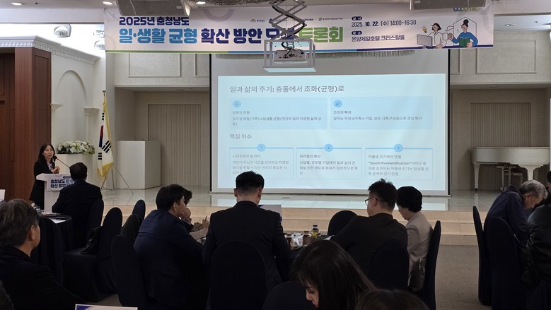 이어 안수영 충남사회서비스원 선임연구위원은 ‘도민의 삶의 질 향상을 위한 일·생활 균형 확산 방안’을 주제로, 충남의 일·생활 균형 지수 향상 전략을 제안했다.