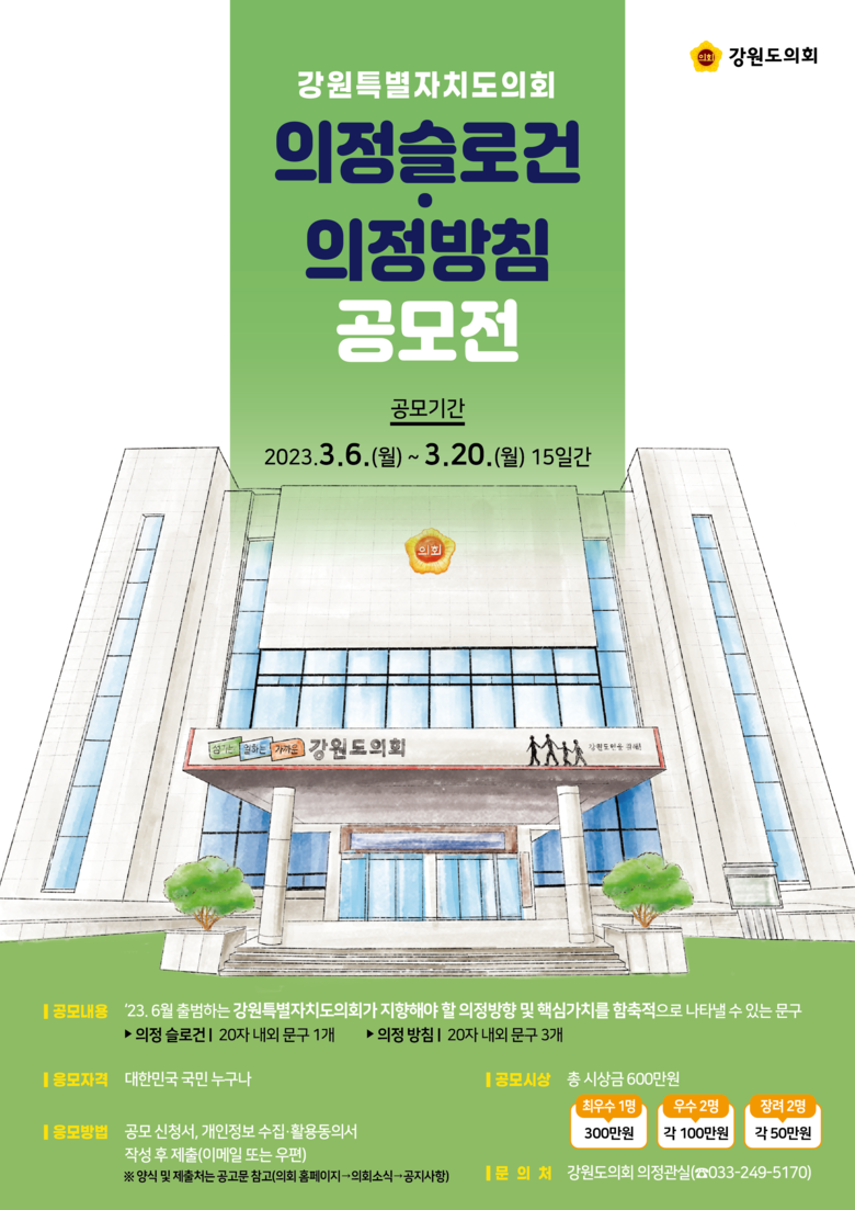 3월 6일부터 3월 20일까지 강원특별자치도의회 「의정 슬로건」 및 「의정 방침」 공모를 진행한다고 밝혔다.