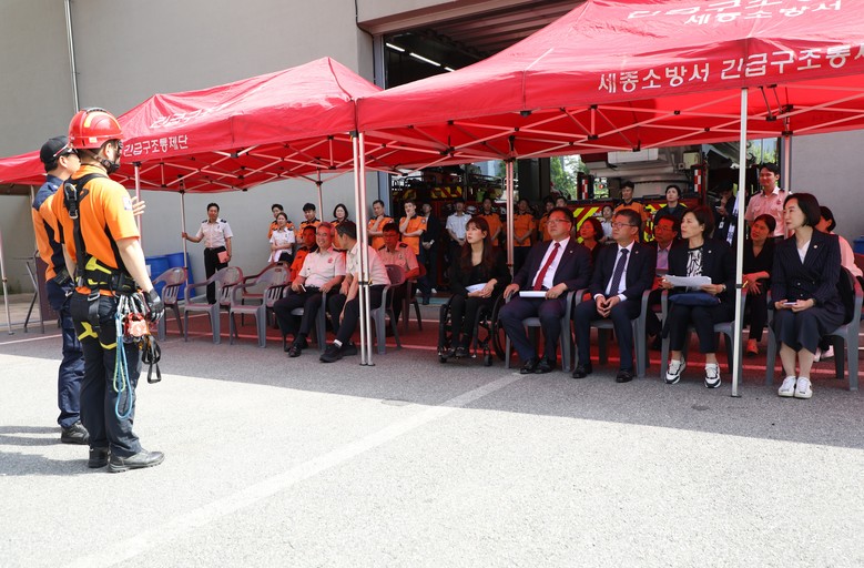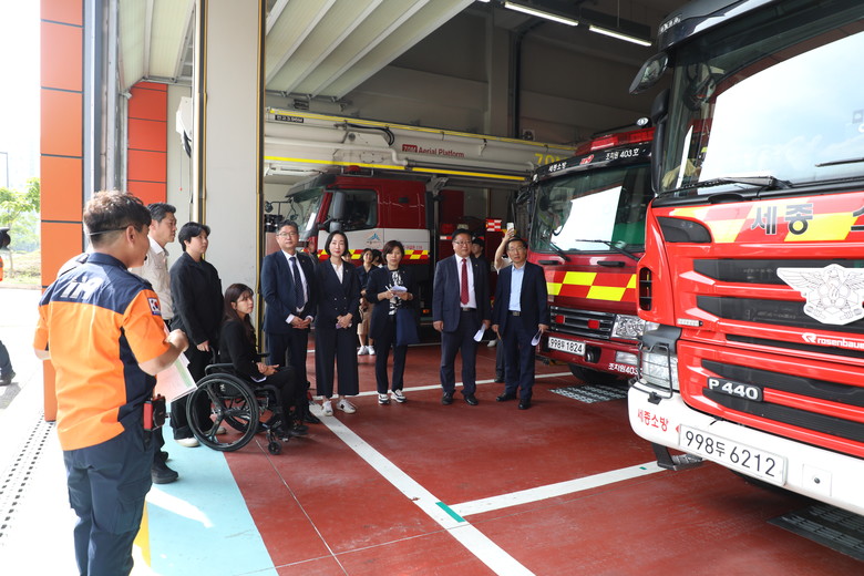 마지막으로 방문한 세종소방서 소속의 어진119안전센터에서는 최근 도입된 장비인 험지펌프차(산불진화차)에 대한 설명을 듣고 고층건물 인명구조 시연을 관람했다.