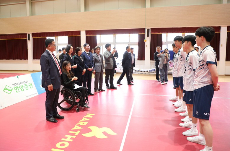 이어서 방문한 세종미래고에서는 시·도대항 세팍타크로 대회를 시작으로 2022년도에 5개의 금메달을 거머쥔 세팍타크로 운동부 학생들을 격려하는 시간을 가졌다.
