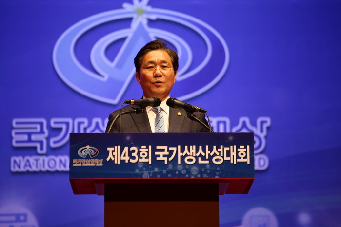 성윤모 산업통상자원부장관이 16일 서울 코엑스에서 열린 제43회 국가생산성대회에서 축사를 하고 있다.