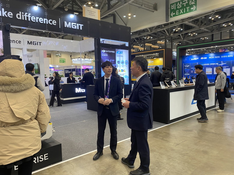 27일 전시회를 찾은 조영완 창원특례시 경제일자리국장은 ㈜엠지아이티 관내 참여기업 등과 현장 간담회를 열어, 드론산업 동향 등을 공유하고 애로사항을 청취했다.