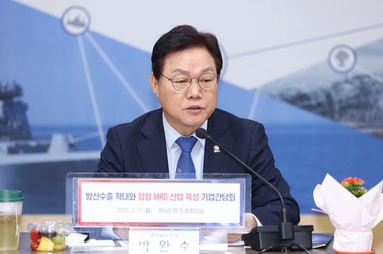 - 수출항공기용 수입자재 수출허가 지원 등 다양한 건의사항 제안 [세계타임즈=경남 최성룡 기자] 박완수 도지사는 17일 오후 2시, 도청 도정회의실에서 열린 ‘방산수출 확대와 함정 유지보수운영(MRO) 산업 육성을 위한 기업간담회’에서 방위산업 육성을 위한 적극적인 지원 의지를 밝혔다.
