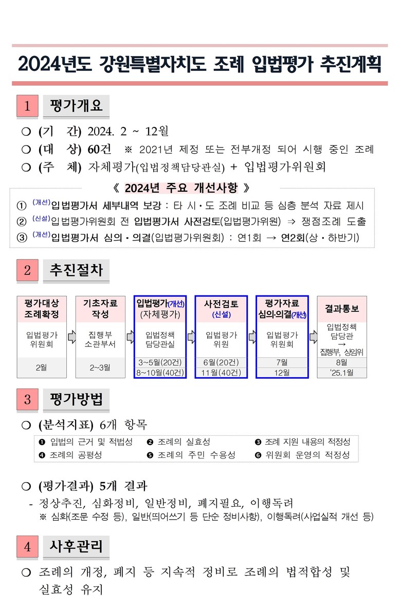 한편, 2024년 입법평가 대상 조례는 강원특별자치도 및 강원특별자치도 교육청에서 2021년 제정 또는 전부개정 되어 시행 중인 조례 60건이며, 입법평가는 조례의 적법성, 실효성, 적정성 등을 평가하여 조례의 입법 목적을 효과적으로 달성·유지하는데 있다.