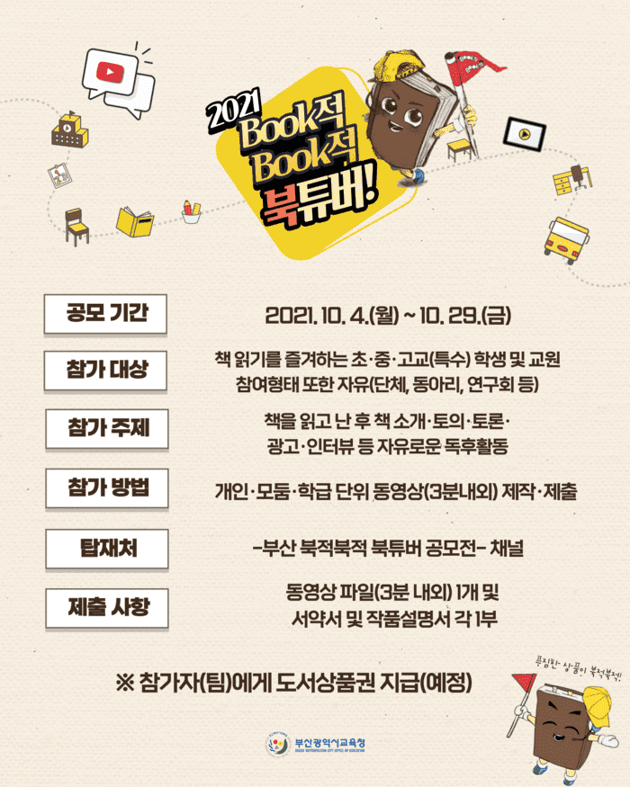[부산=세계타임즈 이용우 기자] 부산광역시교육청(교육감 김석준)은 10월 4일부터 29일까지 부산지역 초·중·고 학생과 교사들을 대상으로 유튜브 채널을 활용해 ‘2021 Book적Book적 북튜버!’ 한마당 행사를 연다.