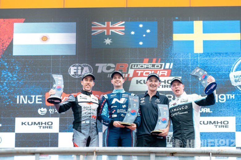 [세계타임즈=방춘재 기자] 10월 18일(토), 인제 스피디움에서 열린 2025 TCR 월드투어 6라운드 레이스1 결승에서 폴포지션에서 출발한 조슈아 버칸은 2위 이하 드라이버들을 여유 있게 거느리고 TCR 월드 투어 한국 대회 첫 승의 영광을 차지했다.