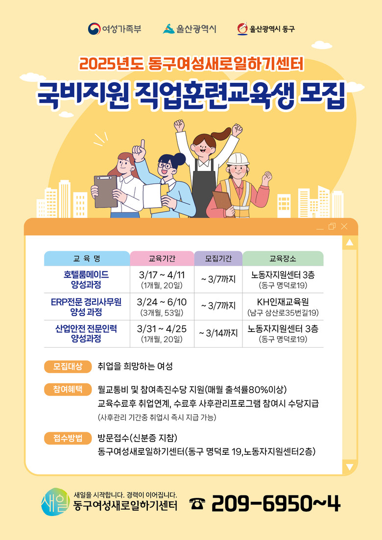 교육신청 마감은 과정별 3월 14일에서 3월 28일까지로 동구여성새로일하기센터(울산 동구 명덕로 19, 2층)에 방문 접수해야 하며, 전화(052-209-6950)로 문의하면 된다.