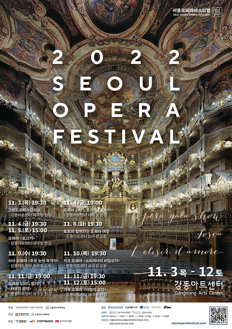 [세계타임즈=우경원 기자] ‘2022 서울오페라페스티벌’이 오는 2022년 11월 3일(목)부터 2022년 11월 12일(토)까지 10일간 강동 아트센터에서 열리며 강동문화재단, 노블아트오페라단 주관, 서울시의 후원으로 개최된다.