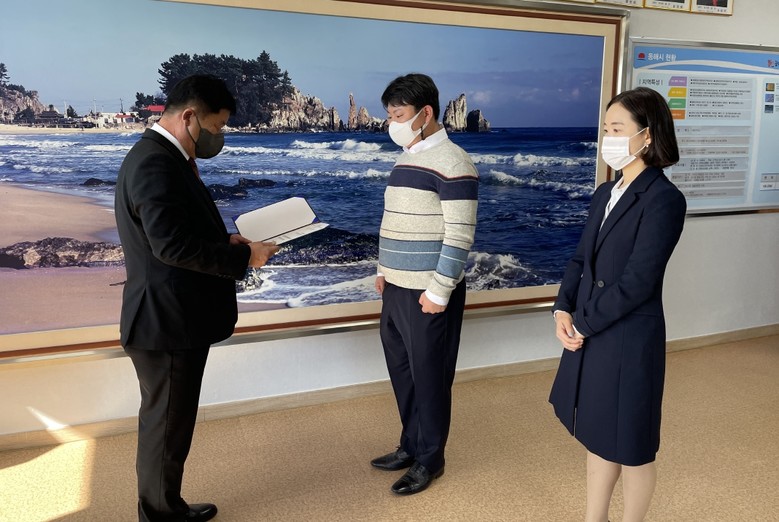 [동해시 세계타임즈=김민석 기자] 동해시의회(의장 이동호)는 12일, 의회 의장실에서 정책지원관 채용시험에 최종합격한 2명에게 임용장을 수여했다.