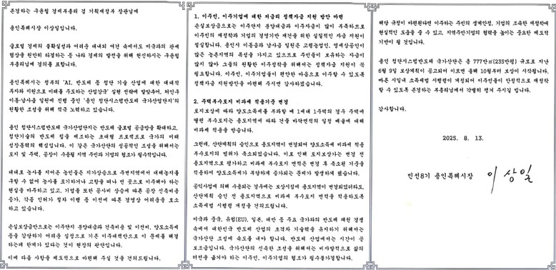 | ▲ 이상일 용인특례시장이 지난 8월 13일 구윤철 기획재정부 장관에게 보낸 '용인 첨단시스템반도체 국가산업단지' 토지 수용 대상 가구에 불합리하게 적용되는 비과세 혜택에 대한 문제 해결을 요청하는 서한문. |