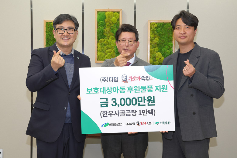 ㈜다담(대표이사 박정훈)과 초록우산 어린이재단(대경권역총괄본부장 문희영)은 대구 북구 내 저소득층 아동과 복지시설 아동들을 위해 사골곰탕 400박스(총 10,000팩, 3천만 원 상당)를 대구 북구청에 전달했다.