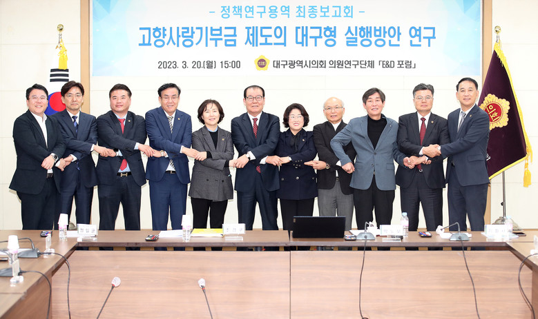 [대구 세계타임즈=한성국 기자] 대구시의회 의원연구단체 「Economy & Development 포럼(이하 E&D 포럼)」(대표 조경구 의원)은 3월 20일(월) 오후 3시 3층 회의실에서 소속단체 의원(대표 조경구, 간사 정일균, 이성오, 임인환, 김태우, 윤권근, 윤영애, 김지만, 이재화, 김원규, 이동욱, 전경원, 육정미)이 참석한 가운데 ‘고향사랑기부제의 대구형 실행방안 연구’용역 최종보고회를 개최했다.
