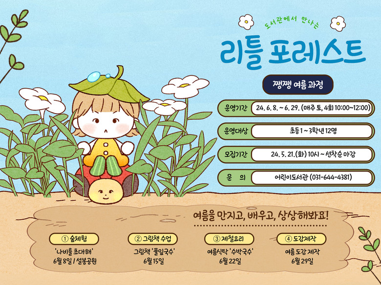 「도서관에서 만나는 리틀 포레스트」 관련 궁금한 사항은 이천시 도서관과 어린이도서관팀(☎031-644-4381)으로 문의하면 된다.
