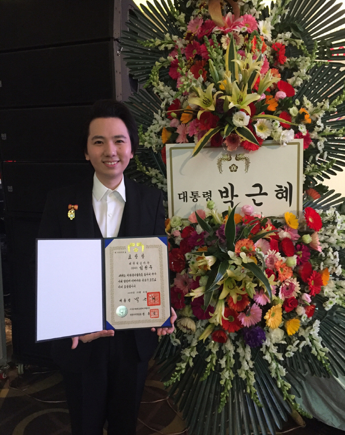 △ 팝페라테너 임형주가 지난 4일 오후 2시 서울시 강남구 대치동에 위치한 컨벤션 벨라지움 3층 그랜드볼룸에서 개최된 ‘UN 세계자원봉사자의 날 기념식’에서 해외순방 중이던 박근혜 대통령을 대신한 정종섭 행정자치부장관으로부터 최연소의 나이(만 29세)로 ‘대통령표창’을 수여받았다.<사진제공=(주)디지엔콤&유니버설뮤직>