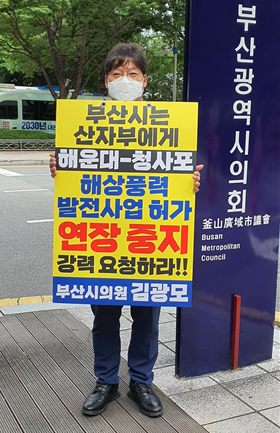 [부산=세계타임즈 이용우 기자] 부산시의회 김광모 의원(해운대구2, 더불어민주당)은 지난 2017년 7월 발전사업 허가 취득 이래 현재까지 ‘해역이용협의’ 조차 진행하지 못하고 있는 해운대 청사포 해상풍력 발전사업자에게 당초 올해 연말까지인 사업 준비 기간을 더 이상 연장하지 못하도록 부산시가 산자부에게 요청할 것을 촉구하기 위해 지난 9일부터 1인 시위를 진행하고 있다.