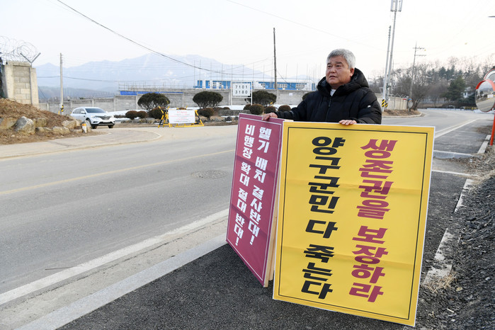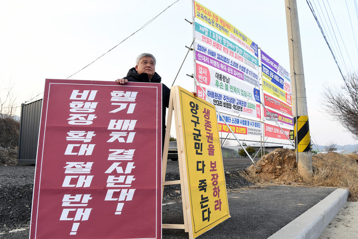 [양구군=세계타임즈 김민석 기자] 양구읍 안대리 헬기부대 확대반대투쟁위원회 사무국장인 김철 군의원이 25일 항공대대 앞에서 1인 시위를 벌였다. 확대반대투쟁위원회는 26일부터 안대리 학조리 주민, 양구지역 사회단체장들의 1인 시위가 렐레이로 이어진다.