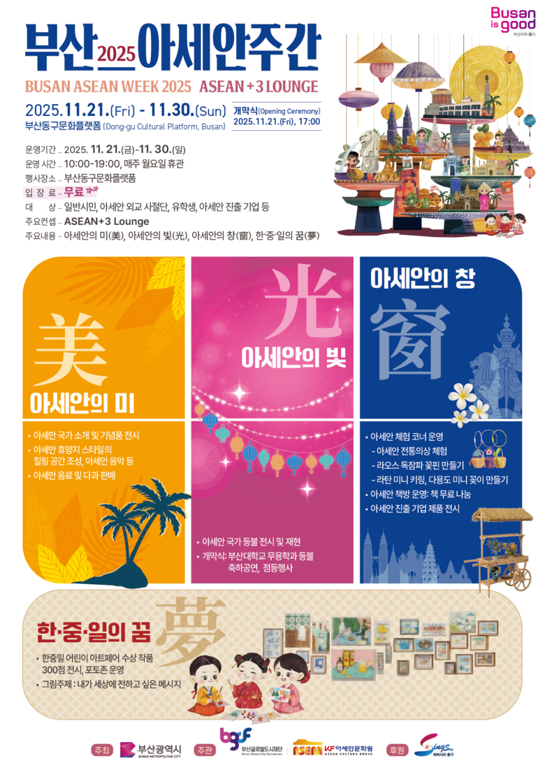행사는 시가 주최하고 부산글로벌도시재단(대표이사 전용우)과 KF아세안문화원(원장 지창선)이 공동 주관한다.