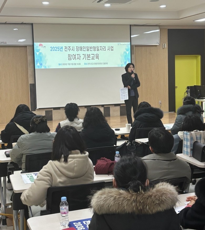 [전주시=세계타임즈 신승민 기자] 전주시는 21일 전주시도시재생지원센터에서 장애인일자리사업 참여자 118명을 대상으로 ‘2025년 장애인일자리사업 기본교육’을 실시했다.