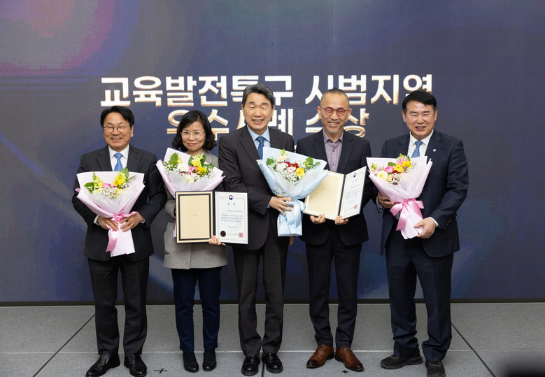 [광주 세계타임즈=손권일 기자] 이정선 광주광역시교육감이 20일 홀리데이인 광주호텔에서 열린 ‘교육발전특구 시범지역 운영 성과보고회’에 참석해 광주광역시와 함께 추진하고 있는 '광주 교육발전특구'가 우수사례로 선정됨에 따라 교육부장관상을 받은 후 이주호 교육부 장관, 강기정 광주시장, 최승복 광주시교육청 부교육감 등과 기념촬영을 하고 있다./광주광역시교육청 제공