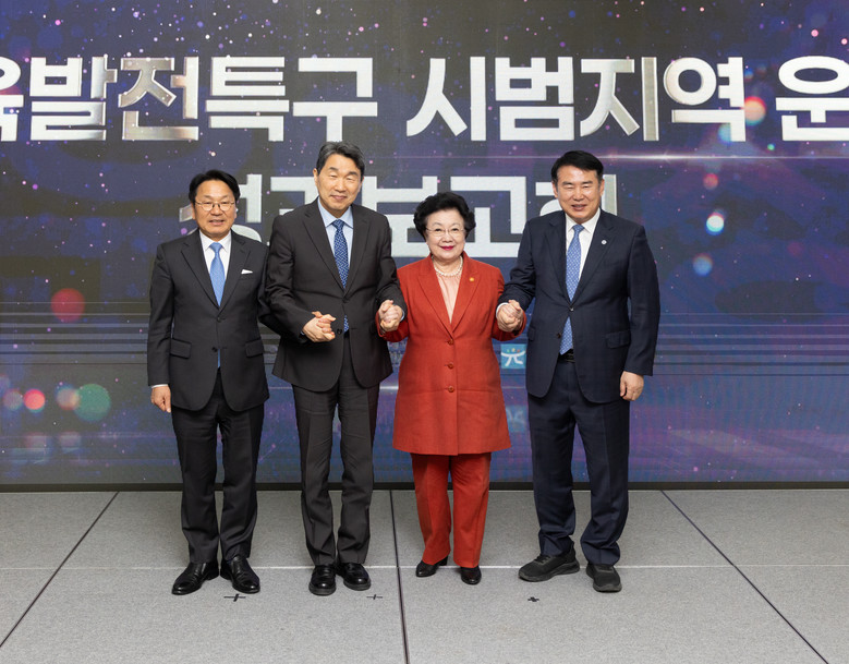 이정선 광주광역시교육감이 20일 홀리데이인 광주호텔에서 열린 ‘교육발전특구 시범지역 운영 성과보고회’에 참석해 광주광역시와 함께 추진하고 있는 '광주 교육발전특구'가 우수사례로 선정됨에 따라 이주호 교육부 장관, 강기정 광주시장, 이배용 국가교육위원회 위원장 등과 기념촬영을 하고 있다.