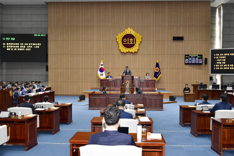 이번 정례회에서는 2023회계연도 결산 6건, 조례안 21건, 동의안 6건, 의견청취안 1건, 규정안 1건, 광주그린카진흥원 원장 후보자 인사청문 경과보고의 건, 기후특별위원회 활동 결과보고의 건, 새로운노동특별위원회 활동 결과보고의 건을 포함 총 38건의 안건을 처리했다.