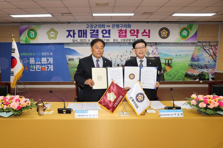 [고창군 세계타임즈 = 강옥선 기자] 고창군의회(의장 임정호)는 은평구의회(의장 기노만)와 24일 군청 5층 대회의실에서 자매결연 협약식을 가졌다.