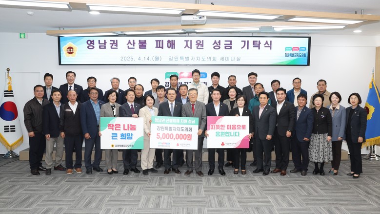 이번 성금은 강원특별자치도의회 소속 모든 의원들이 자발적으로 동참해 조성한 것으로, 산불 피해로 어려움을 겪고 있는 이재민들에게 위로와 응원의 뜻을 전하고, 신속한 복구를 염원하는 의회의 뜻이 담겼다.