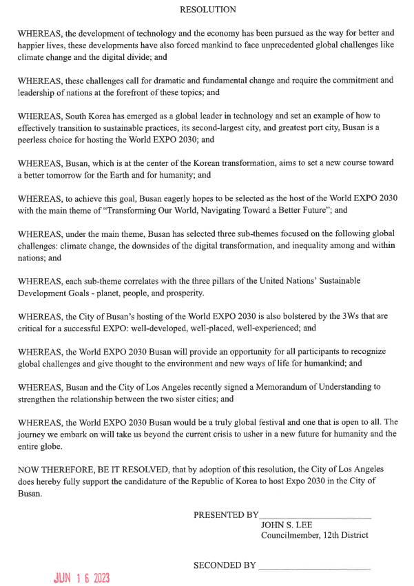 따라서 이제 결의안을 채택함으로써 로스앤젤레스 시는 대한민국이 부산에서 2030년 엑스포를 개최하는 것을 전적으로 지지합니다.