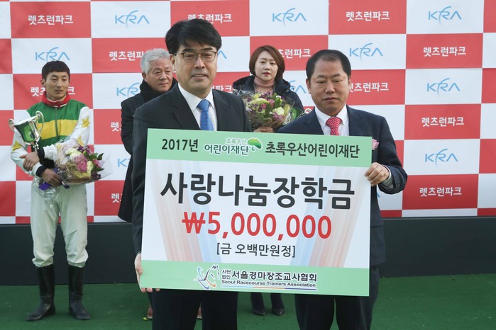 경주를 마친 뒤 진행된 시상식에는 한국마사회 장동호 경마개최위원장, 홍대유 서울조교사협회장이 참석해 우승자에게 트로피와 축하의 꽃다발을 전달했다. 또한 이날 조교사들이 ‘트레이너스컵’을 기념해 자체 조성한 ‘사랑나눔장학금’ 500만 원을 소외된 어린이들에게 기부했다. 초록어린이재단 이성진 서울지역본부장이 기부금 전달식에 참석해 기부금을 전달받았다.
